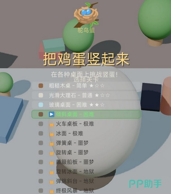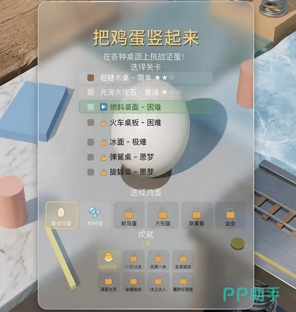 当前版本共设置12个关卡,对应12种材质各异的底面环境——从高摩擦橡胶到低附着力玻璃,每种材质均影响鸡蛋滚动阻尼与回正响应速度,难度呈阶梯式递进。整体界面设计遵循极简主义风格,视觉干扰极少,便于集中注意力观察细微角度变化与运动趋势。