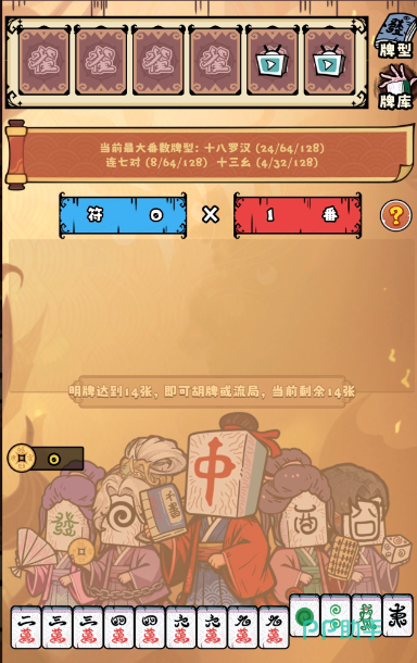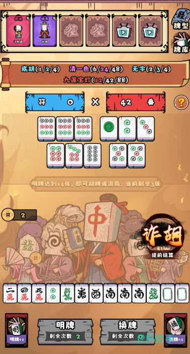每局开局提供5次明牌与换牌机会:玩家可将手牌置于牌区实现“明牌”,也可主动替换任意数量的手牌,系统将等量补入新麻将牌。核心目标是通过策略性换牌与明牌组合,构建符合胡牌规则的牌型,并在单局内达成关卡设定的分数门槛即可通关。