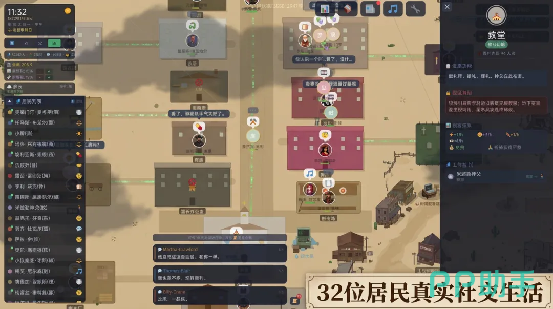 游戏时间背景设定于十九世纪末的美国西部,一座隐匿于群山之间的宁静小镇——甜水镇。玩家以匿名研究者视角介入,全程无需点击、拖拽或完成任务,仅通过静观方式见证居民每日起居、职业活动与人际互动。这种去干预式设计,构成了本作最显著的差异化体验标签。