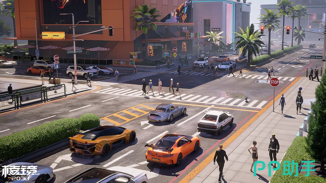 基于虚幻引擎5底层技术开发,游戏以写实级物理渲染还原未来都市风貌,涵盖金属反光、环境光遮蔽、动态焦散、次表面散射等高级材质表现,在昼夜交替、天气系统及复杂光影交互中持续输出电影级画面精度,强化玩家在科幻语境下的临场代入感。