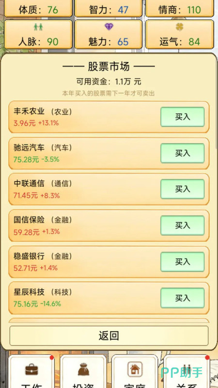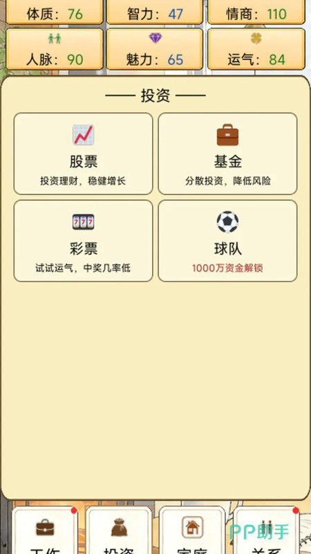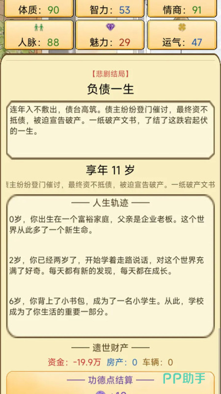 游戏内置多维属性成长体系,涵盖健康、智力、情商、财富四大核心维度。各项数值并非孤立存在,而是彼此联动影响事件触发概率与结局走向。例如高情商可提升人际关系质量,从而解锁隐藏社交事件;高健康值延缓衰老进程,增加晚年可操作时间窗口;而财富积累则关系到医疗资源获取与子女教育投入等现实抉择。