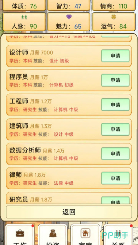 游戏采用动态属性演化机制:角色初始天赋存在差异,所有基础数值均非静态设定,而是随事件参与程度、行动结果成败、时间推移及人际互动质量持续浮动。例如一次高强度职场挑战可能显著提升智力但同步损耗健康值;一段稳定婚姻关系则可能增强情商并间接改善财富积累效率。这种双向耦合的成长模型,使每段人生轨迹都具备不可复刻的独特性。