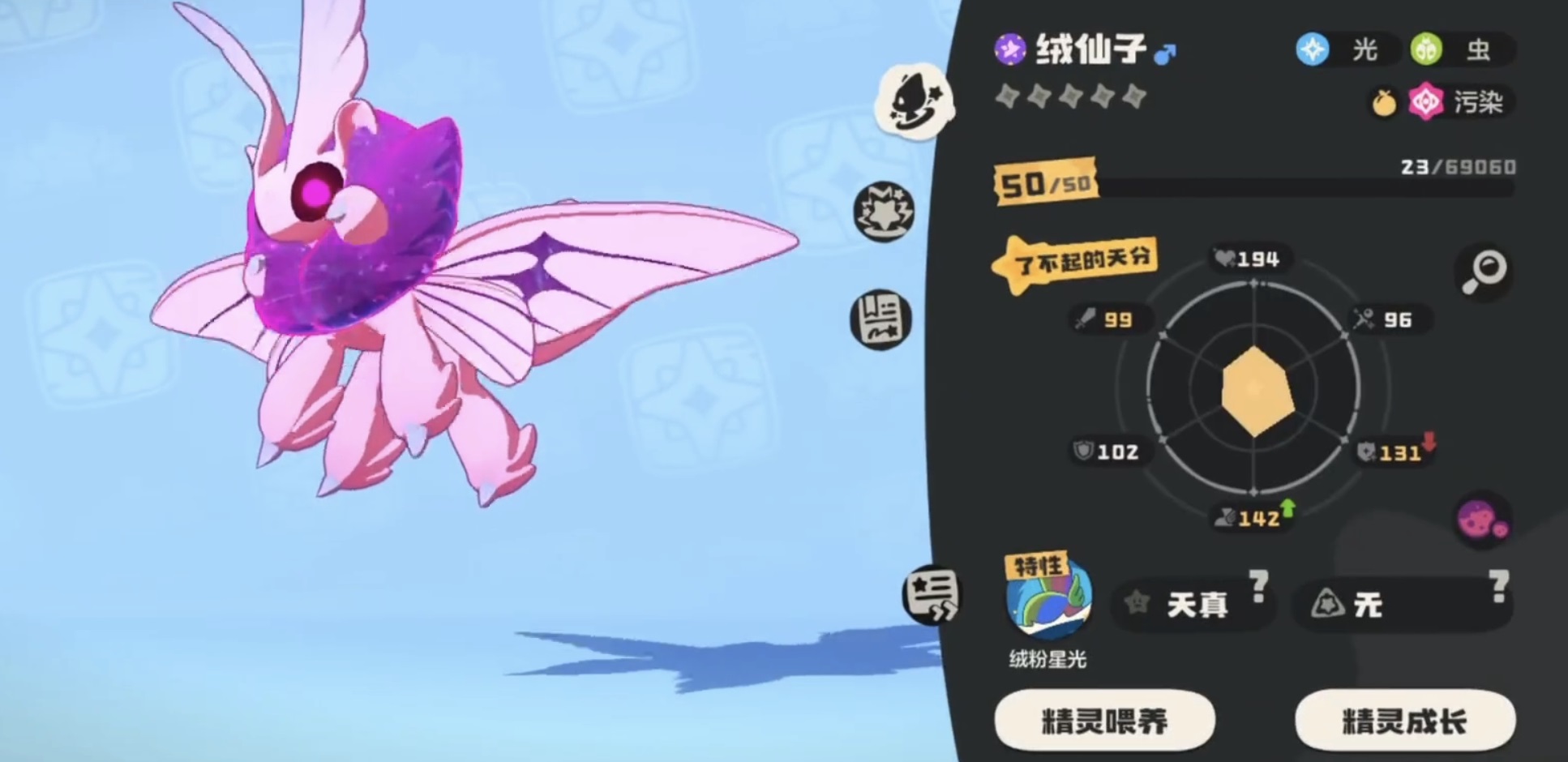 实战中,绒仙子可适配两种主流流派:极速先手流与高爆发输出流。核心技能组合灵活——若侧重多段协同,推荐逆光(伤害随队友系别数提升)、闪光(80点固定伤害,必中)、假寐(恢复HP、解除异常状态并回复PP)及虫鸣或光之壁垒;若专注单体压制,则可选用逆光、闪光、光刃与聚光四技能搭配。辅助向构筑则以光之壁垒、蝶舞、假寐、虫鸣为核心,强化控场与续航能力。