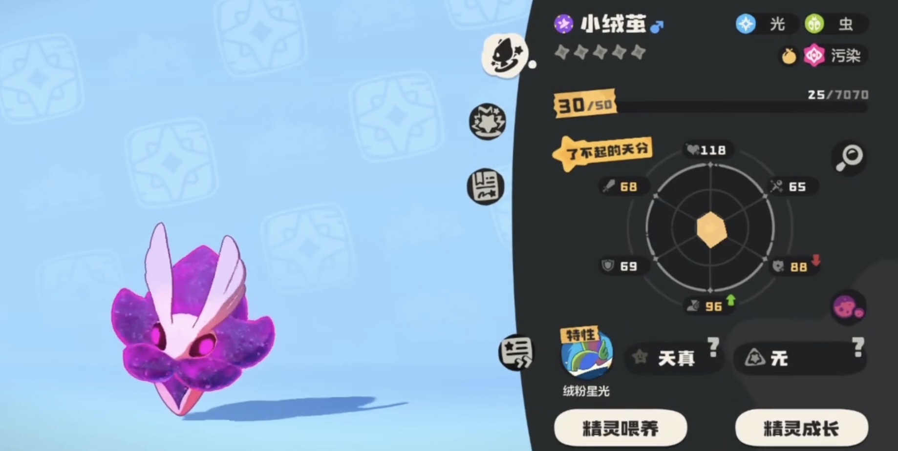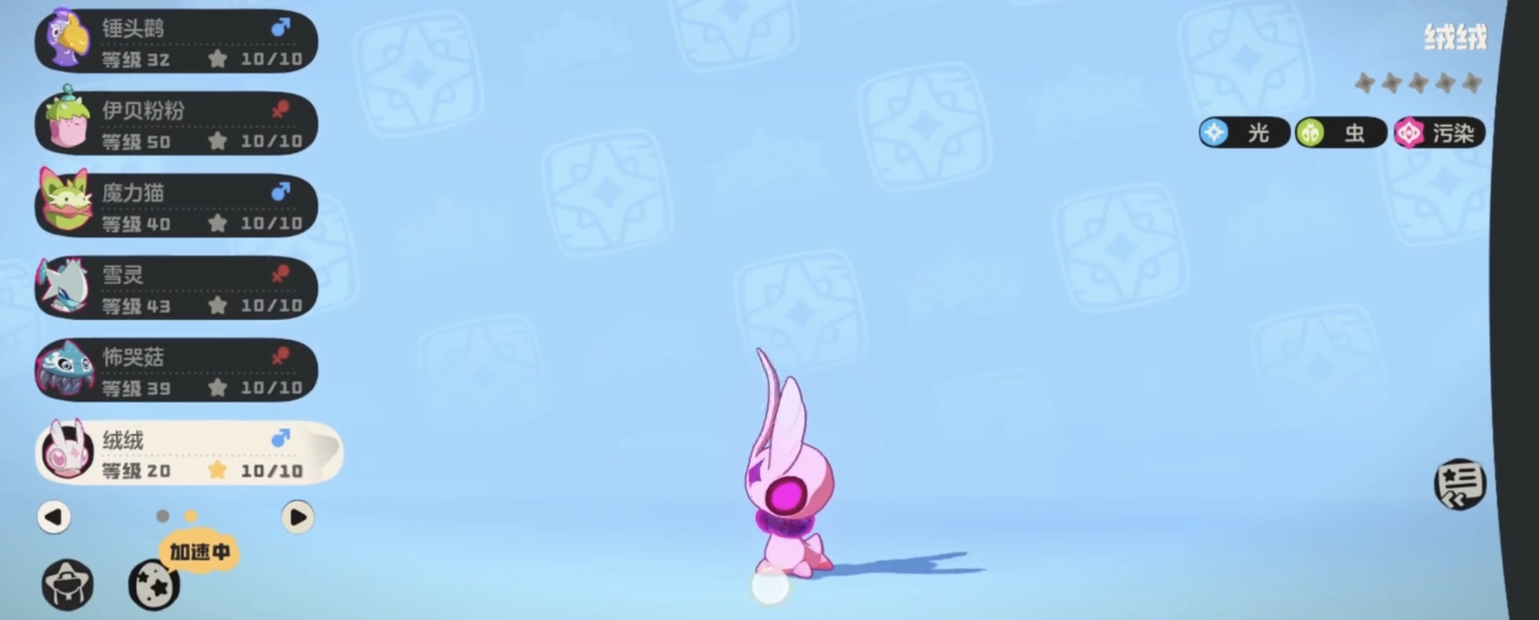 推荐养成节奏为:捕捉绒绒后,通过常规经验果快速提升等级,优先达成27级与47级两个关键节点。满级建议拉至100级以发挥全部潜力。属性加点侧重速度与魔防,兼顾生存与先手权;血脉推荐选择普通系或草系,可强化护盾效果与持续作战能力。性格方面,胆小为最优解,提供速度+10%加成,契合其高速联动定位;开朗、保守、沉着等亦可备选,但速度向性格始终具备更高战术优先级。