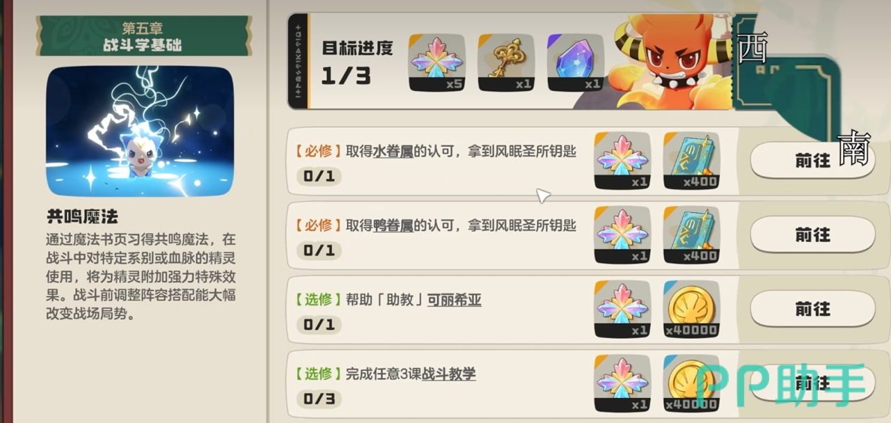 捕捉精灵这件事,很多人一开始喜欢见到什么就扔球,其实成功率很低,球也费得快。比较稳的做法是先打一打目标精灵,把它的血量压下来再投球,成功率会明显高一些。另外,捕捉的时候,最好带着点目的性,比如手上有火系宠物,就可以去找水系或者草系的精灵来配,这样遇到不同属性的关卡,手头有得换,不至于一套阵容打到底然后翻车。新手引导那条线上的任务也要记得做,里面有几个节点,比如精灵升到12级、完成一定数量的图鉴收集,做完了会给不少奖励,包括经验、金币还有一些比较难弄到的道具。
