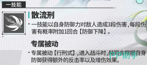 赫同在使用自身技能的时候,有一个普攻叫做散流刑,使用这个普攻时他会带来场内的刑罚,对敌人进行三段式的输出,当然这类连击效果是只能针对一名敌人进行攻击,这类攻击的话,是相当于他自身125%的防御输出,而且每一段的输出当中都有25%的概率,可以带来防御下降的影响,这个防御下降虽然只能叠加到一个回合,但是只要是进入战斗,就会给自身带来更多的防御加成,体现到的就是500点的防御加成,所以在这里这个概率大家后期通过每一段的百分比叠加,也可以保证他有更多的机会可以让敌人进入破防阶段,对于他自己的增益效果来说,就是在反击能力上面有12%的成功概率,以及后期在伤害结果上面有6%的提升了,所以他的普攻相对来说能够使用到的技能效果都有很多。