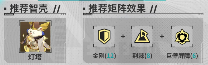 建议大家为他搭配智壳的话,可以用的是灯塔,然后矩阵效果当中推荐金刚、荆棘、巨壁屏障,这都是非常适合他用来自身防御力提升效果的搭配,这样的话根据他的防御能力,进入战斗的时候,他获取的额外反击概率也会更高,自身的增伤数值也会相比来说,根据百分比计算起来得到更多的输出加成。
