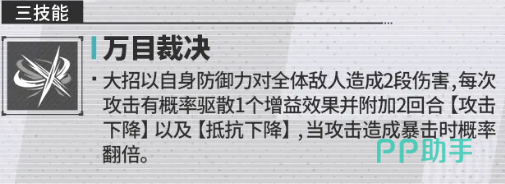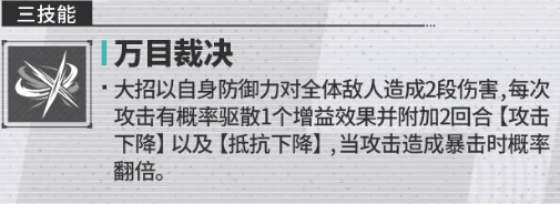 另外他在自身的终结技能,也就是必杀大招效果上面,可以带来一次裁决能力,这个叫做万目裁决的技能,会让他对敌方造成一次群体输出,攻击范围覆盖到敌人全部目标以后,会带来两段式的连击,此时每一段都带来180%,相当于他自身防御的伤害数值,而且这里每一次攻击效果当中,还有50%概率也就是一半的机会可以触发一个驱散能力,对于驱散来说,是将其中一个增益效果从对面敌人身上给驱散掉,后期附加两个回合的攻击下降,也就是说他会拿一个负面效果去换对面身上的增益效果,以及抵抗下降这类能力也是可以施加到敌人身上的,所以放在这里他换过去的负面效果可以给我方带来更多在控制上面的优势,后期他的攻击能力当中,如果成功触发暴击,在此时他带来这个驱散能力,且将负面效果换过去的概率也会直接翻倍,也就是说原来只有一半的概率可以触发,但是现在的话,他会有百分百的概率可以触发。