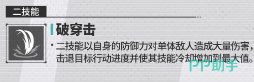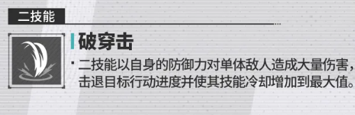 第二个技能叫做破穿击,这个能力相对来说的话是他经常用在连招里面的,使用此类攻击,他会带出一次斩击,对敌人进行输出的同时,同样也是针对单体且身上防御受到损害的敌人,对此类敌人进行攻击的时候,他造成的输出百分比上面有480%的基础伤害,这类基础伤害会比他普攻上面的伤害高很多,但是在额外附加的效果上面,没有第一个技能那么多,他此时只有一个击退目标,之后会获取百分百行动进度的升级效果,而且这个概率他成功触发,也达到了百分百的概率,那么后期就可以让他技能冷却时间也得到部分的加速,所以这个技能放在这里的话,虽然需要4个回合冷却,用起来大家得到的结果还是比较好的,毕竟这里有一个百分百的击退可以用起来。