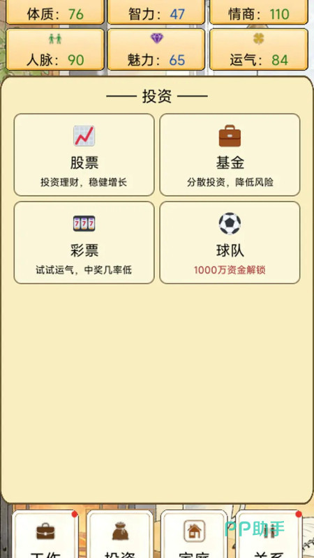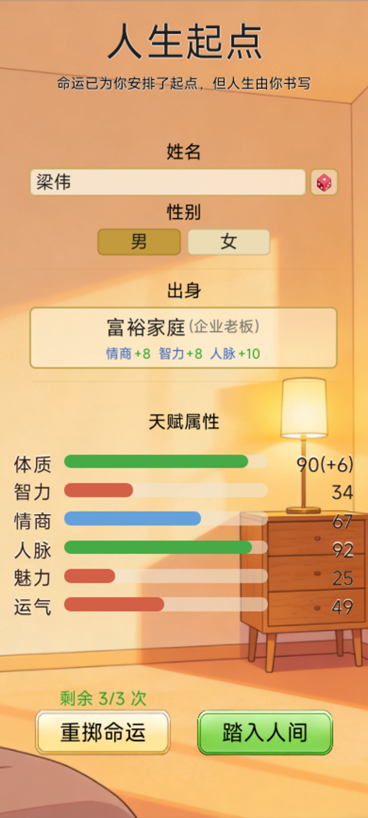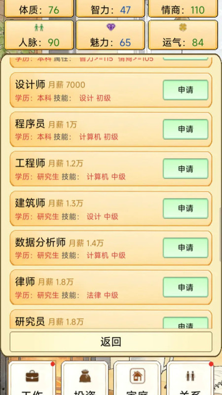 为了更加贴近现实人生,游戏设置了比较深的属性和成长系统。角色具有健康、智力、情商、财富等基本属性,这些数值不但是数字,也是角色生活状态的直接反映。通过事件选择和具体行动,这些属性就会发生变化,从而影响后面事件的可能选择以及结果。高智力可以打开学业上的捷径,好的健康状况是享受一切的前提,因此策略的规划就显得十分重要。