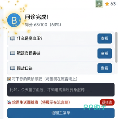流言墙互动功能的加入使游戏更具趣味性。在这里玩家可以与其它玩家交流自己的经验,互相学习医学知识,讨论最新的病例,也可以在为患者做出诊断后得到患者的表扬甚至收到锦旗。互动不但使游戏具有了社交性,而且加强了玩家之间的联系,使每一个参与者都有自己的价值感。每一个玩家的成长和进步都可被看见,是大家一起见证彼此的成长与进步。