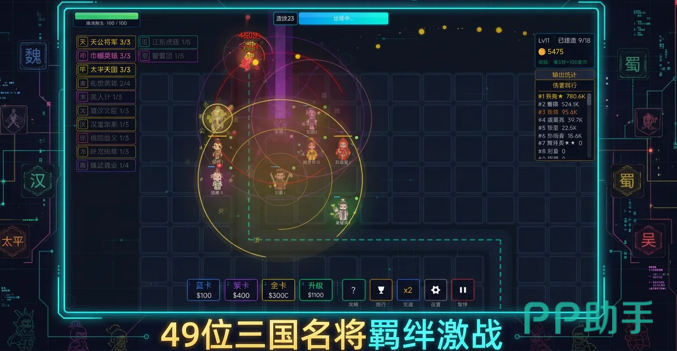 核心玩法围绕塔防布阵展开,需根据敌潮特性调整武将站位与技能组合,迎战不断升级的无尽敌潮,考验玩家的战术布局与即时应变能力。