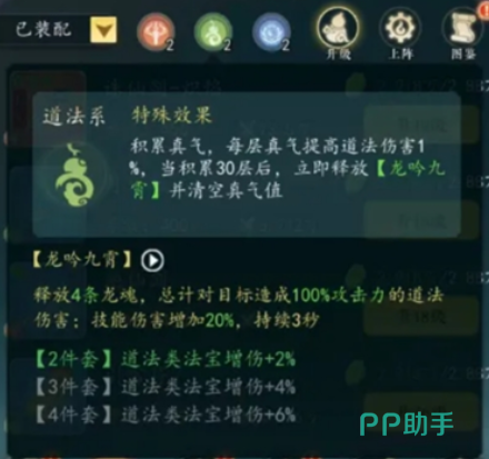 当你身上携带道系法宝并释放技能时,可叠加真气值buff,每一层可使伤害提升1%,最高能够累计到30层。此时将会清空全部真气值层数,并立即释放神通技能,龙吟九霄,对敌方造成巨额的伤害,同时获得一个提升自身伤害的buff,可让你在接下来的三秒之内,所有的法宝伤害提升20%。总而言之,如果你平时的作战风格是速战速决,并且比较喜欢近身作战的话,那么道法系绝对是最适合你的流派。