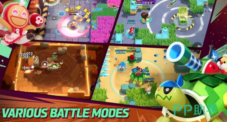 开局之后,玩家们会发现地图是完全随机的,而每张地图都有着不同的特殊情况,比如说在糖果风暴这张地图里面将会不定时的落下糖果雨,成功拾取糖果之后,各项能力都能够得到强化。而在冰霜战场这张地图里面,地上会时不时的结冰,此时场上所有人的移动速度都会得到限制,这就需要考验玩家们的预判能力了,如果没能及时规避的话,很容易吃到敌方的AOE伤害。场景中的墙壁和各种掩体都可以被破坏,进一步增加了游戏的可玩性。