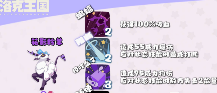 第三个是花影羚羊,偏控制方向。她可以带蝙蝠技能,直接吸走对面的血量来补充自己,生存压力比较小。除此之外,她还有两个控制技能,一个是阻挡,能打断对面正在释放的技能;另一个是惊吓盒子,可以直接减少对面两格能量,让他们短时间内没办法快速回到高能量状态。