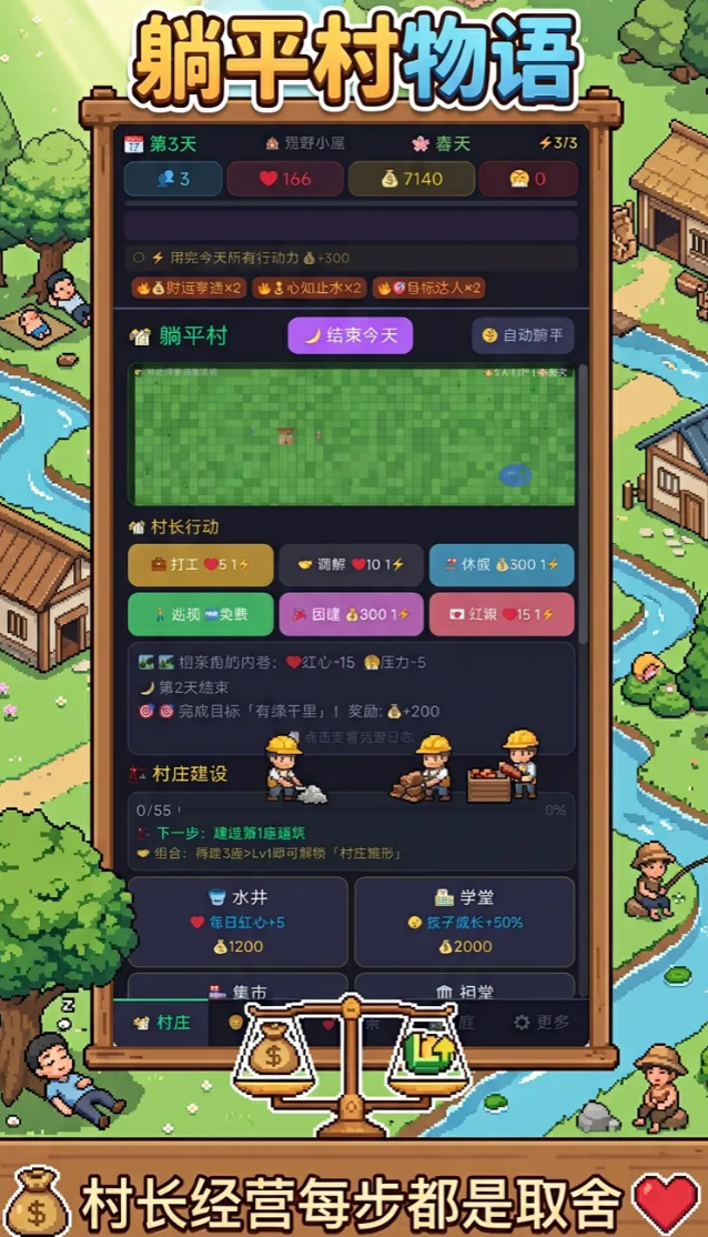 除了个人生活模拟之外,村庄建设的更多玩法也被这款游戏所呈现出来。玩家需要一块一块地规划村庄的布局,修建水井、学堂、建市集、办酒馆等每一个步骤的影响都会对村民的幸福指数以及村庄的发展方向产生作用。看着孩子们在新建的学堂里读书,村民在温馨的住所里繁衍,那种从无到有和由乱到治的成就感油然而生。