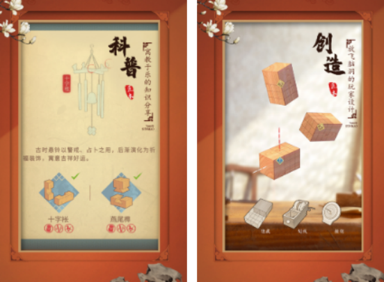 这是一款非常好玩,融入了国粹的解谜手游,需要玩家在玩的过程当中发挥自己在空间方面的想象力,上手极为容易,需要通过点击消除等操作模式,不断的收集不同的物件图纸,完成相应的解密任务。不仅是非常益智的手游,还融入了创造,甚至是科普等丰富的知识,可帮助玩家在玩游戏的同时,了解很多与项目有关的内容。