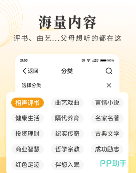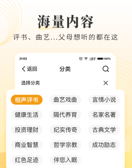 它是很适配中老年的听书软件,专门做了适老化设计,大字体、大图标,界面干干净净没有复杂按键,眼神不好、不太会用智能手机的长辈也能一眼看懂、一学就会。内容全是长辈爱听的传统评书、戏曲选段、养生知识、经典老故事,语速舒缓、发音清晰,还支持离线下载,没网也能听。