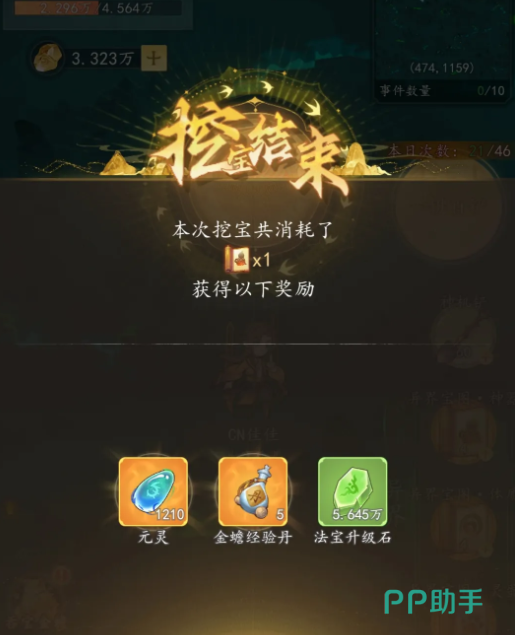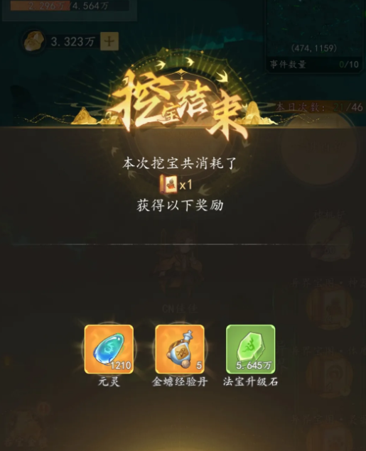 每次挖宝都需要消耗一张地图,可以通过持续挖宝获取更多物品奖励,各种蓝色,紫色的宝物奖励都会随机出现,挖宝过程中还有机会出现橙色宝图,每个宝图可以兑换210元灵,20张橙色宝图可以转化成四张异界宝图,可以用宝图兑换资源培养金蝉,每次参与挖宝基本都能得到经验丹,利用经验丹可以提升金蝉的气血攻击和防御能力,喂养破镜丹之后,可以让金蝉境界也得到提升,没有获取破镜丹的玩家,可以直接去融元商店购买,争取让金蝉快速提升到下个等级。