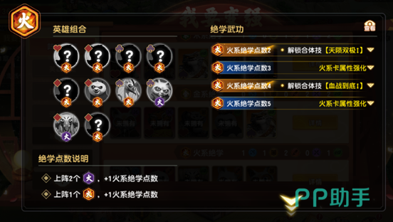 ④火系绝学(含火系绝学·残):共10位英雄,满阶需5点绝学值(1个完整火系英雄=1点,2个火系绝学·残=1点)