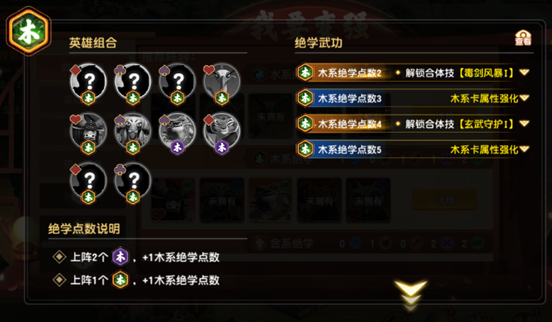 ②木系绝学(含木系绝学·残):共10位英雄,满阶需5点绝学值(1个完整木系英雄=1点,2个木系绝学·残=1点)