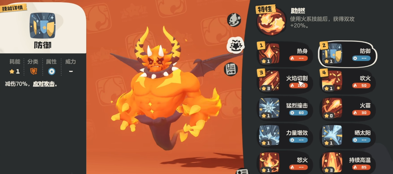 完成进化后,烈火战神将激活核心天赋“烈焰”,使所有火属性技能基础威力提升25%;其特性“烈焰焚烧”可提高施加烧伤状态的成功率,并同步提升自身基础暴击率,形成持续压制能力。