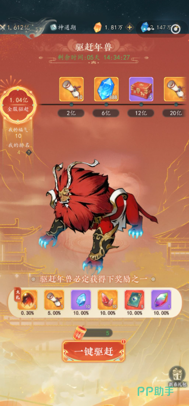 宠物培养所需资源并非依赖单一途径。日常高频玩法“百宠乱斗”是稳定产出渠道——通过与其他玩家宠物实时对战,获胜后不仅提升段位排名,还可获得大量进阶材料、技能石及经验丹。限时活动“驱赶年兽”虽非常驻,但操作门槛低、节奏轻松,资源回报集中,特别适合新手玩家快速积累初期培养物资。