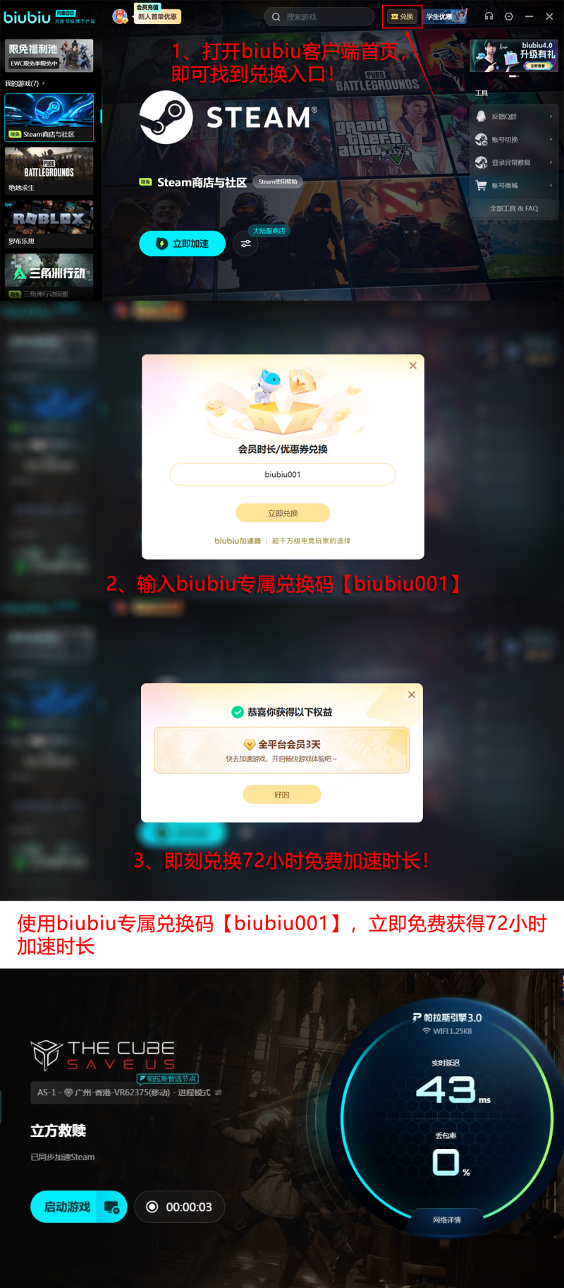 目前,biubiu加速器提供全量免费体验权益:所有用户输入激活码【biubiu001】即可领取3天加速时长;新注册用户额外获赠24小时专属礼包。两项叠加后,总计可享96小时免付费加速服务。实测表明,即使使用免费额度,仍可完整实现低延迟、不掉线、无卡顿的沉浸式游戏体验,助力玩家深度探索立方世界规则,熟练掌握战术机制,彻底告别因网络波动导致的非战斗减员。