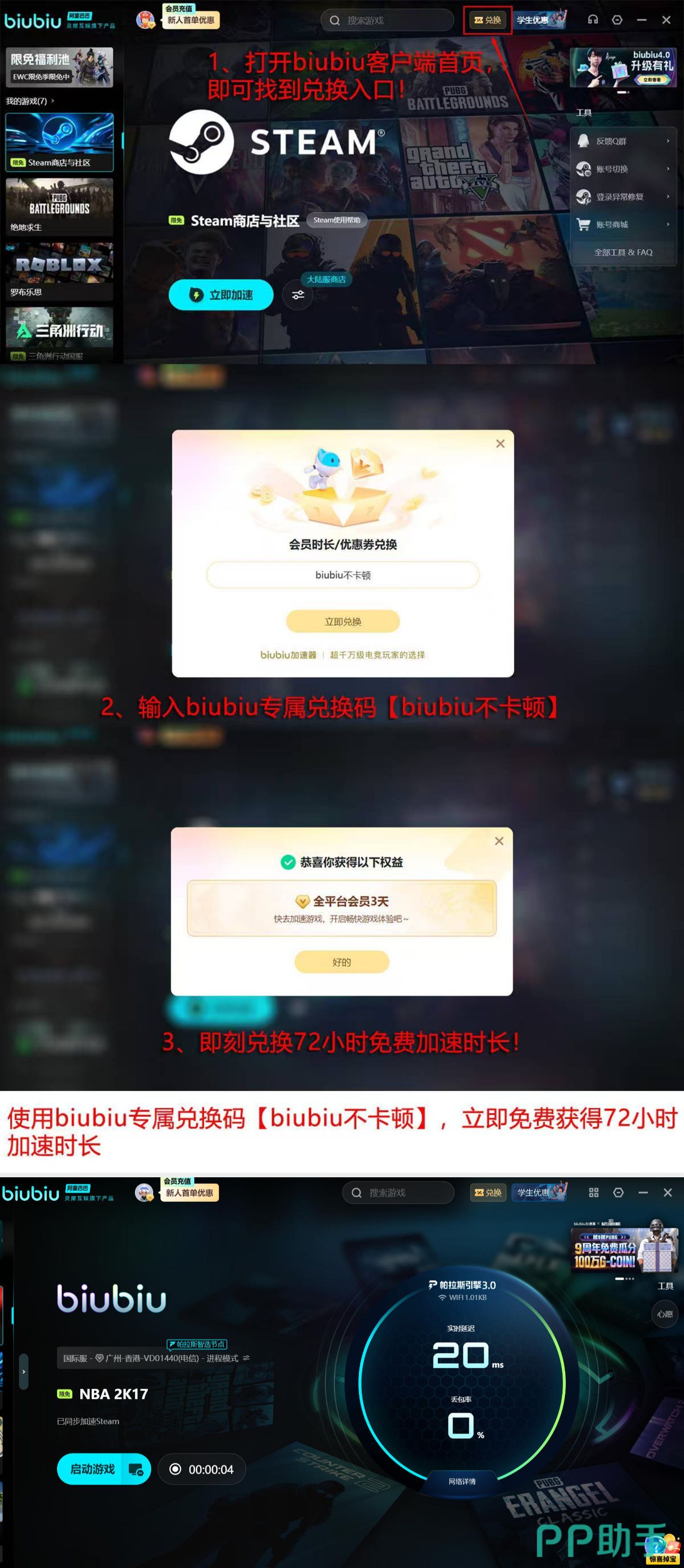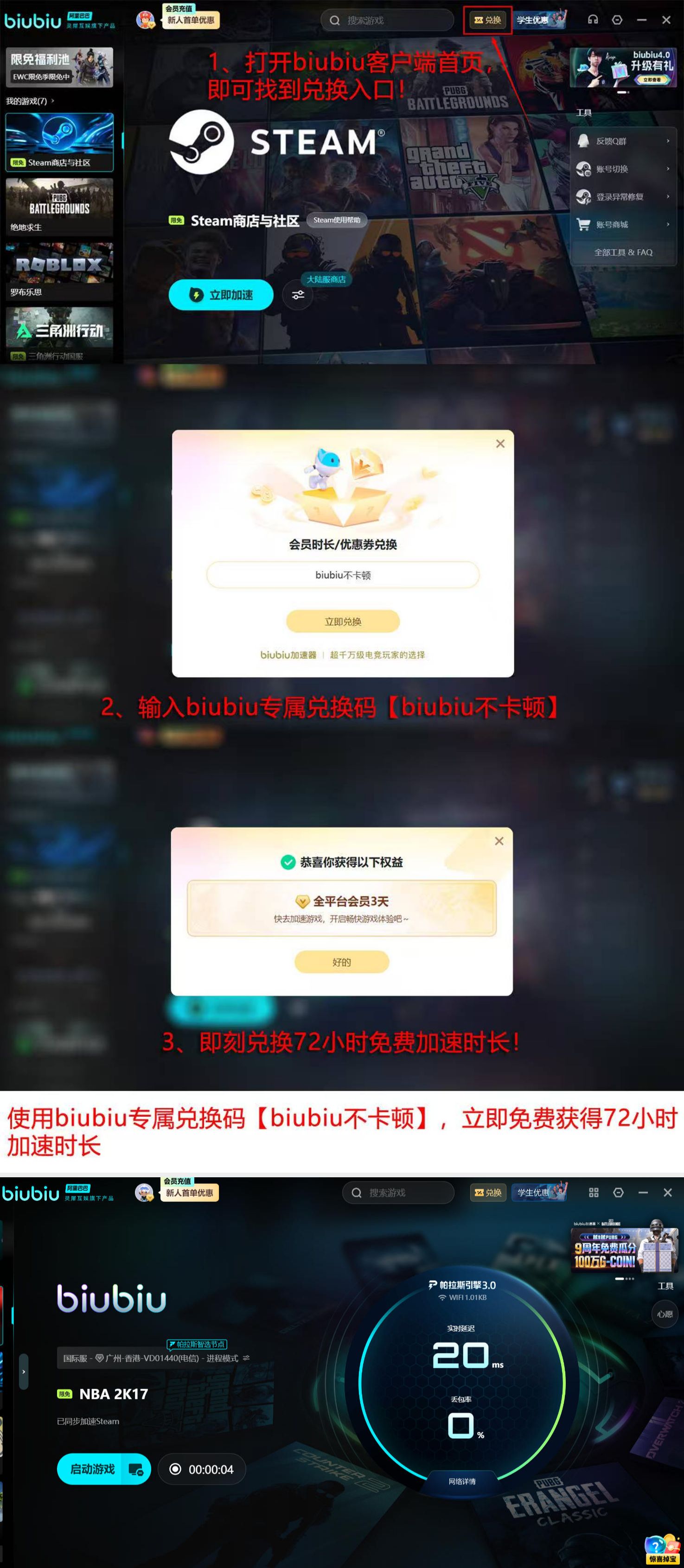 当前biubiu加速器面向全平台用户推出限时福利活动:新注册用户可立即获得24小时全游戏通用加速时长;老用户输入兑换码【biubiu不卡顿】即可额外领取3天有效期,累计可达96小时。该权益覆盖Steam、Epic、WeGame等主流平台,适用于NBA2K17及其他对网络稳定性敏感的竞技类游戏。
