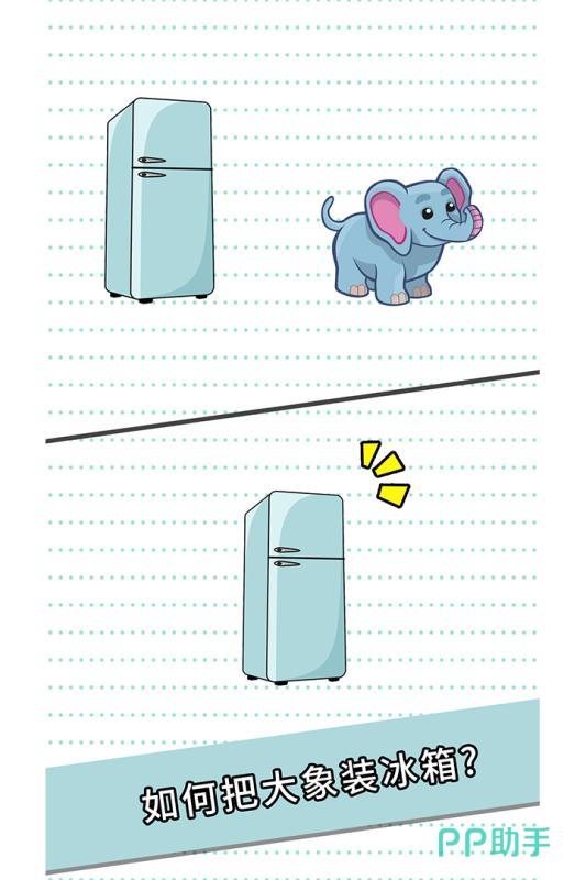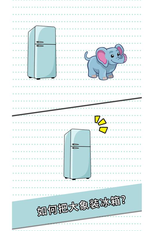 该作采用情境解谜模式,每关设定一个生活化荒诞命题(例如“如何把大象放进冰箱”),要求玩家依序完成开门、装象、关门三步操作。题目不依赖专业知识,重在激活常识联想与逆向思维。动画演示清晰,步骤提示明确,无文字输入需求,兼顾趣味性与认知激活深度,有助于延缓老年人执行功能衰退。