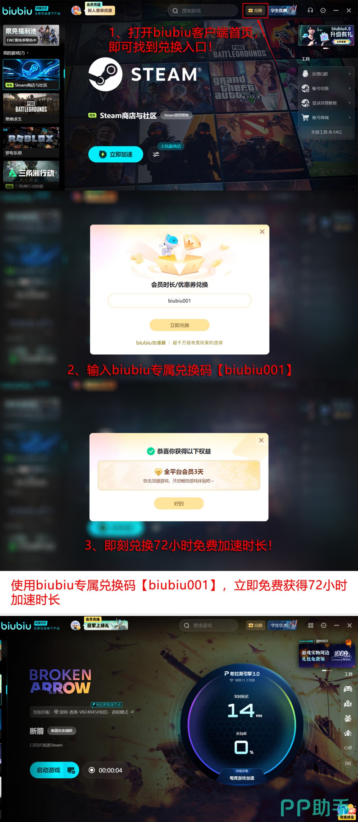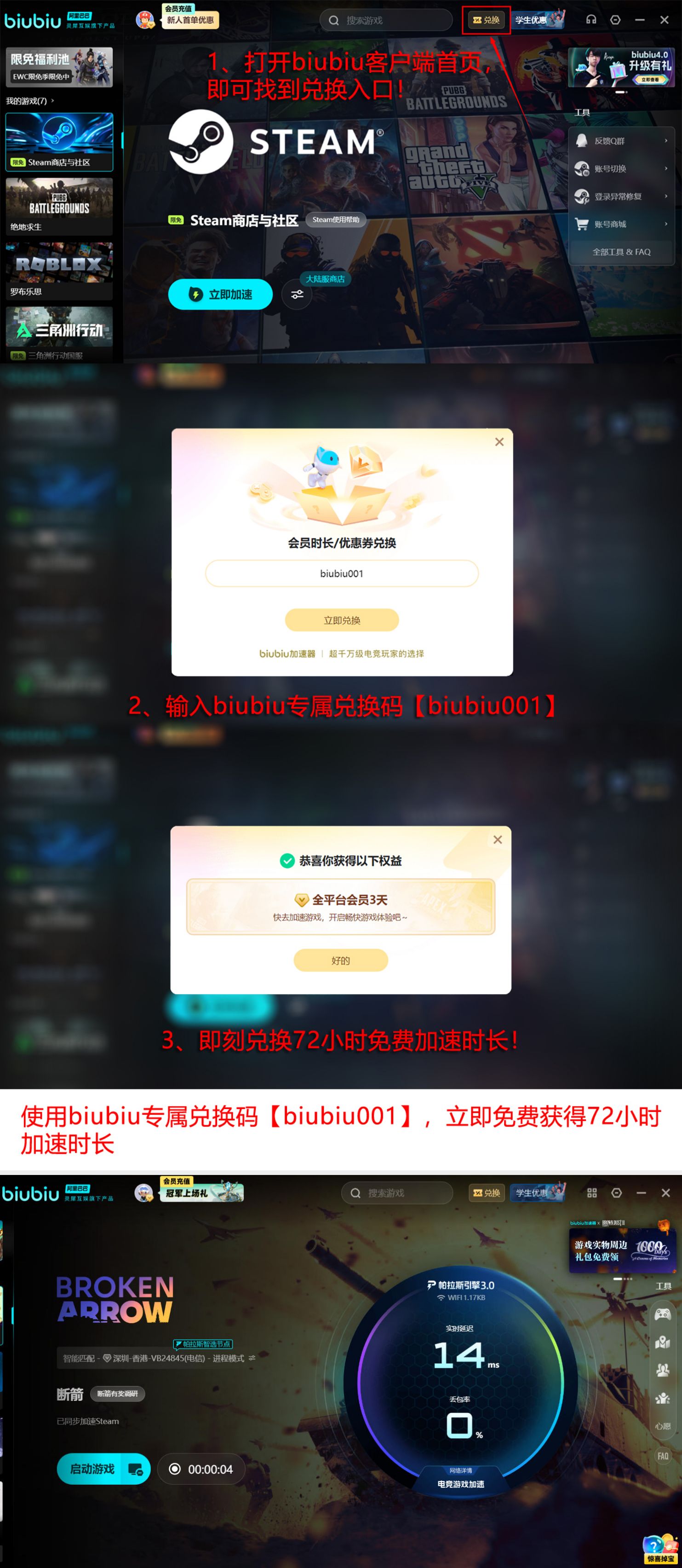 依托大厂级技术底座,该加速服务同步开放多项新手权益:首次注册用户可享总计96个小时免费加速时长;完成账号激活后即时到账24小时基础权限;用尽初始时长后,输入兑换码【biubiu001】即可额外领取三天加速特权。