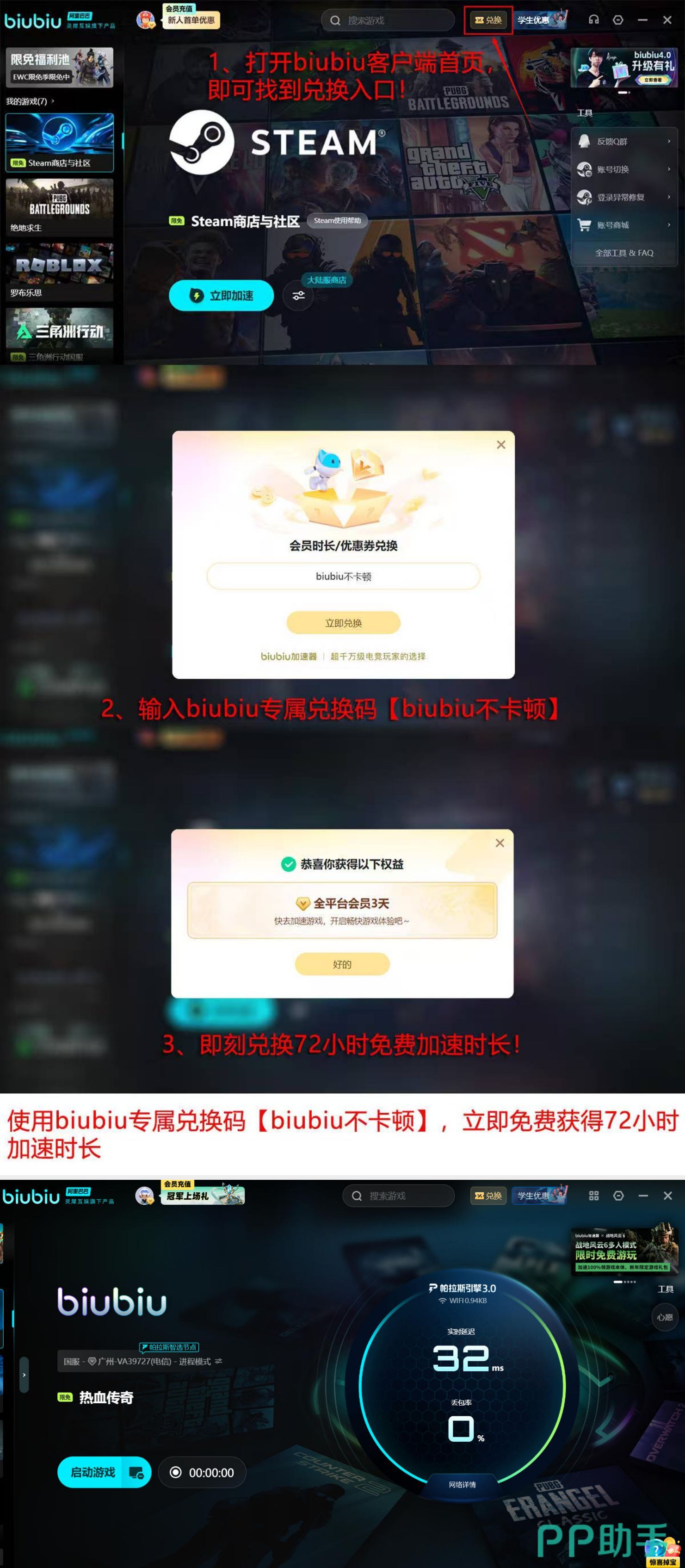 新用户完成注册后,可立即获得24小时免费加速时长,零门槛体验核心功能。使用完毕后,输入通用兑换码【biubiu不卡顿】,无论新老用户均可额外领取72小时加速权益,累计达96小时,足以支撑连续多日稳定游戏。