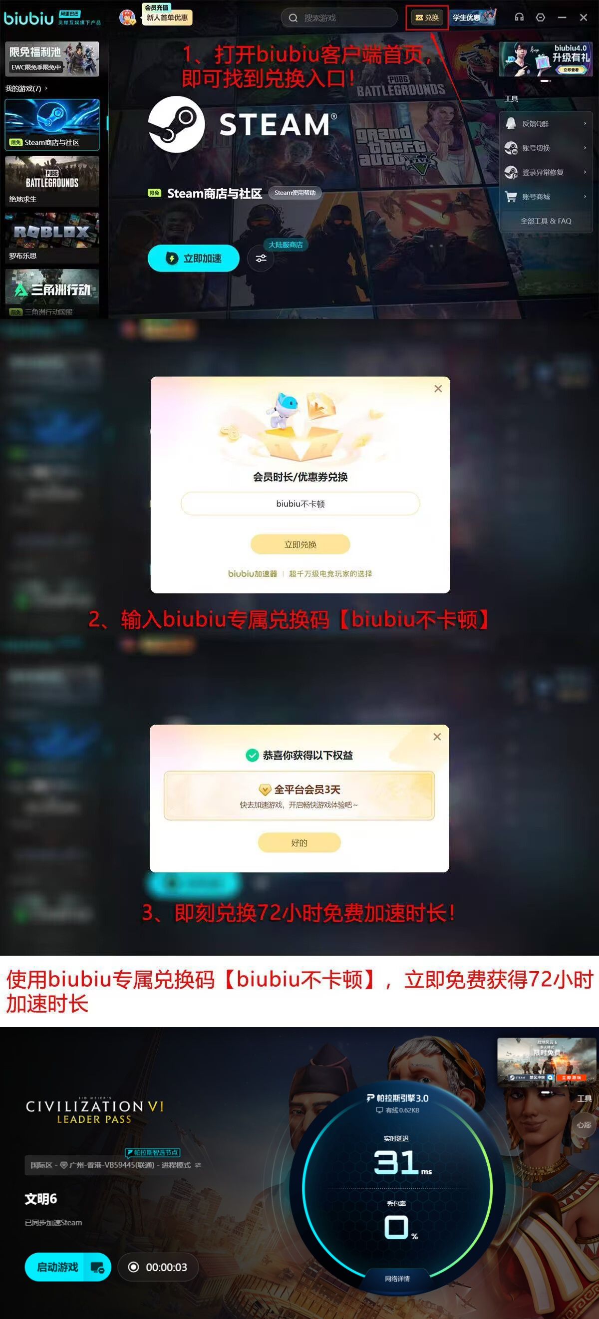 为助力新用户快速上手,平台提供注册即享24小时免费加速权益;所有用户均可在兑换中心输入口令【biubiu不卡顿】,领取额外3天高级加速服务。此外,biubiu社区同步整合《文明6》全流程战术指南、伟人搭配逻辑、科技树速通路径及多人合作机制解析等内容,便于玩家针对性提升决策效率与文明发展节奏。