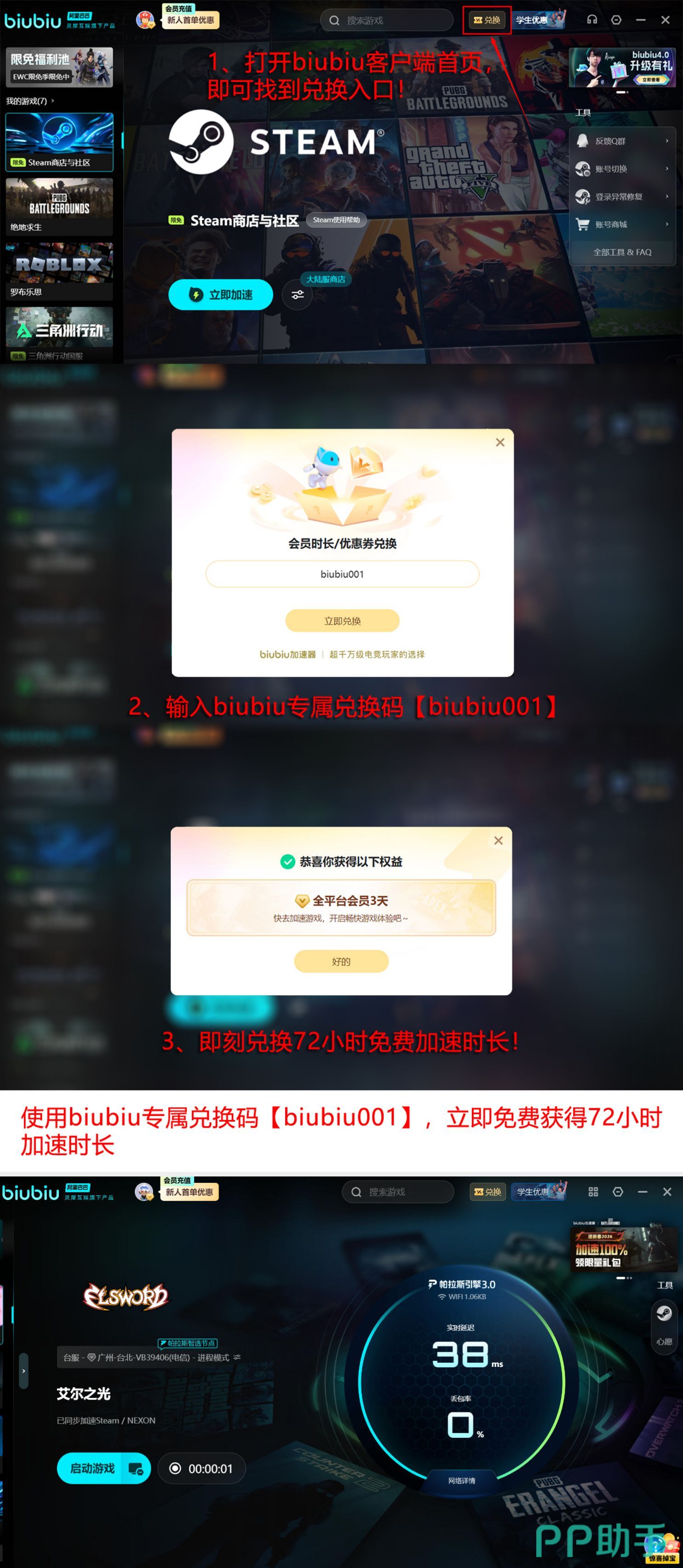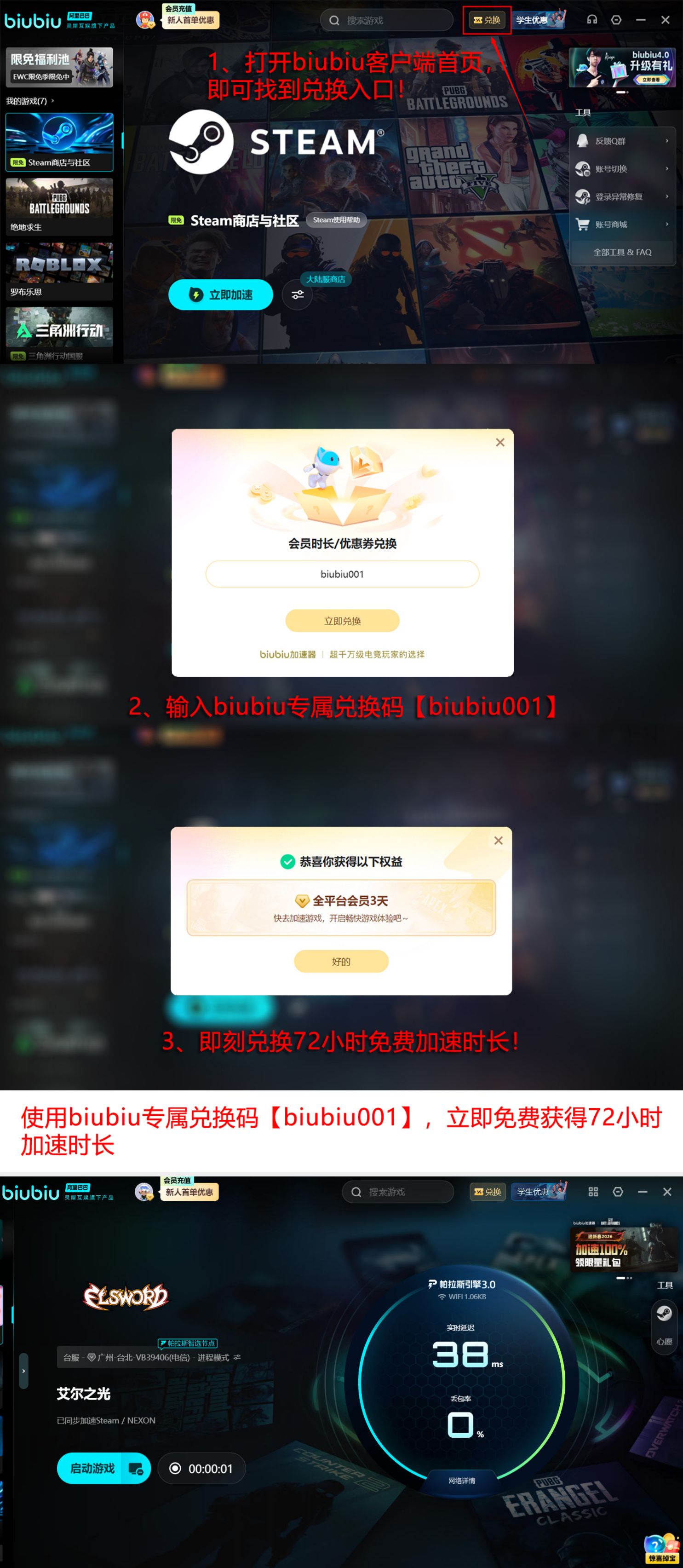 目前biubiu加速器面向新用户提供超长免费体验周期,总计可达96小时。获取方式明确分为两步:首次完成账号注册并成功激活后,系统将自动发放24小时加速时长;使用完毕后,输入专属兑换码【biubiu001】,即可额外领取72小时免费加速权益,全程无需付费或绑定支付方式。