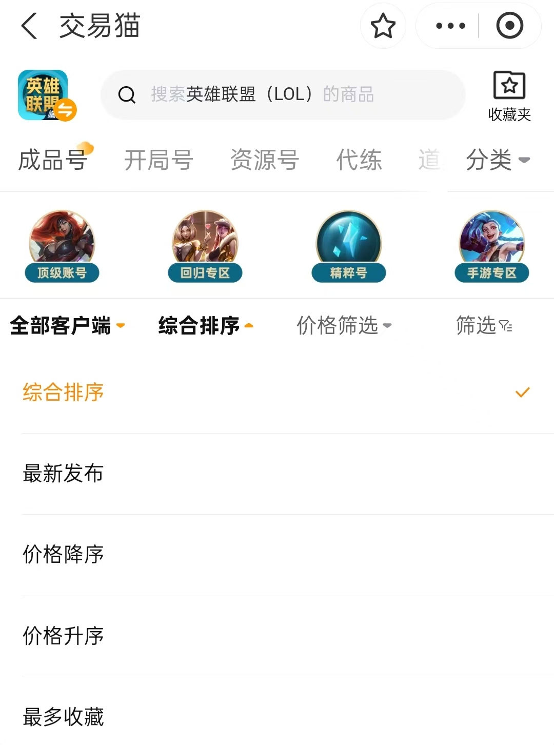在交易猫平台购买或出售《英雄联盟》账号操作便捷:支持按账号类型(如新注册号、满皮肤成品号)、英雄数量、皮肤类别、等级段位等多维度筛选;同时提供价格区间限定、升序/降序排列等功能,帮助不同预算的用户高效匹配目标商品。