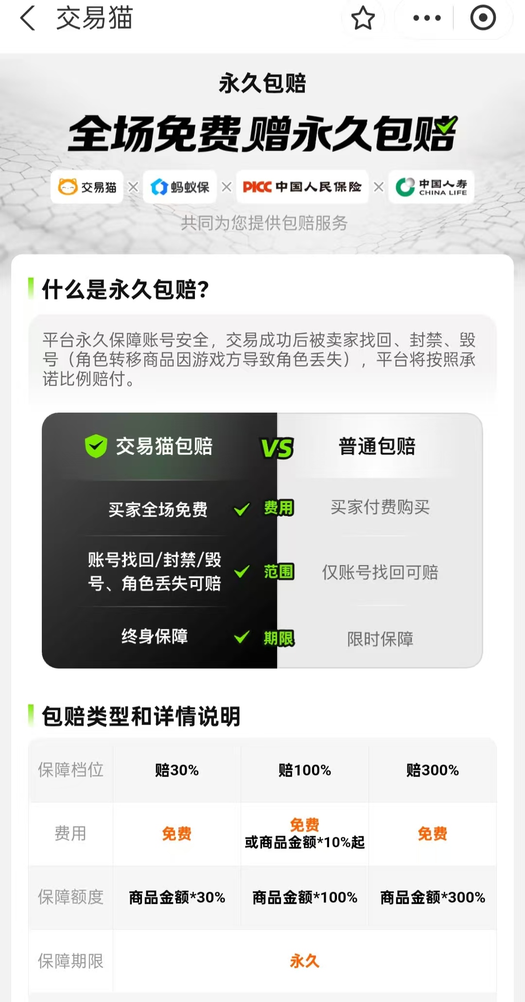 除商品资源丰富外,平台还提供售前验号服务,买家可在付款前验证账号状态真实性;交易完成后,更有“永久包赔”保障机制——若出现账号被原主找回、遭隐藏封禁、角色数据异常或账号损毁等情况,经平台核实属实后,将依据约定比例予以赔付。
