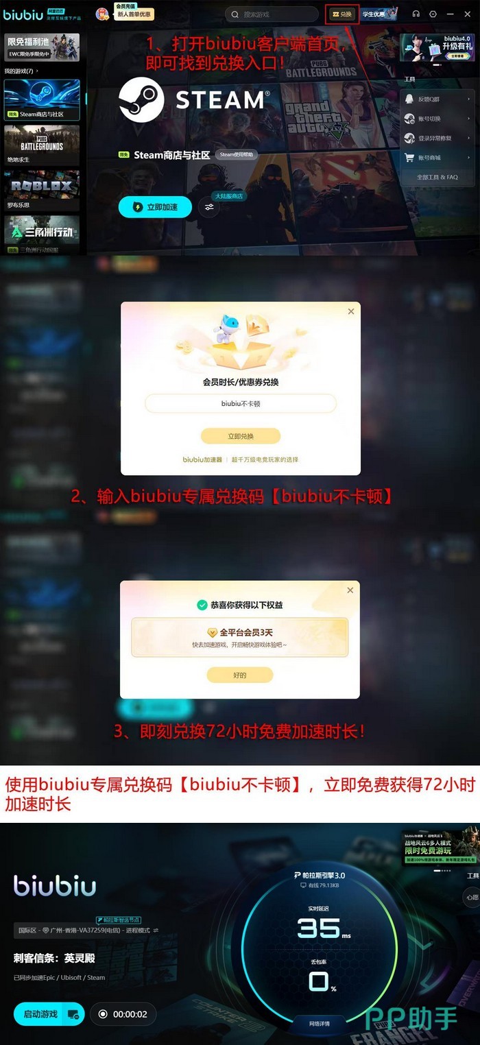 为降低用户决策门槛,biubiu提供分阶段免费试用权益:新注册用户自动获得24小时全功能体验时长;完成首次登录后,输入口令“biubiu不卡顿”,即可额外领取72小时加速权限,累计可达96小时无限制使用周期。