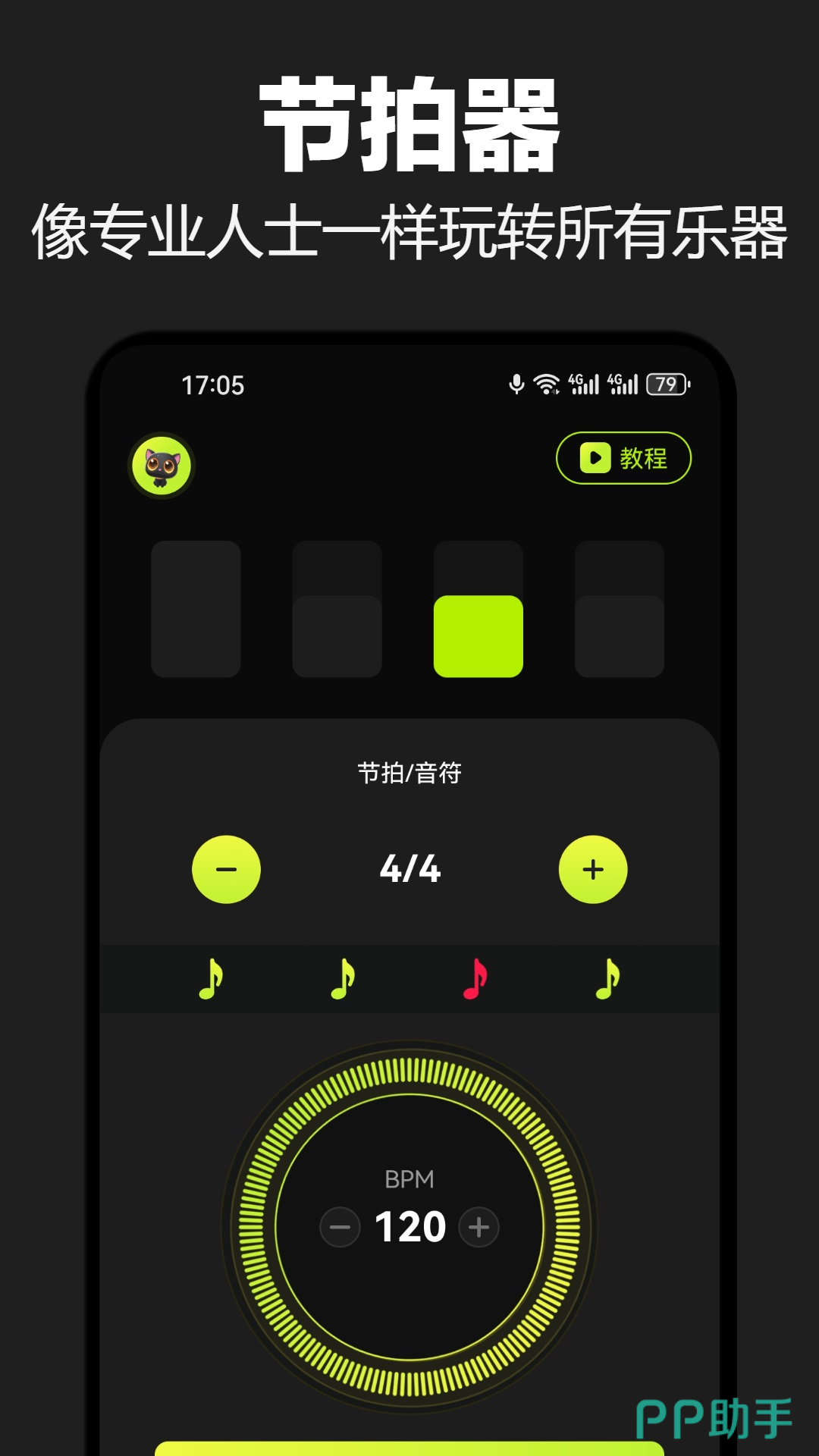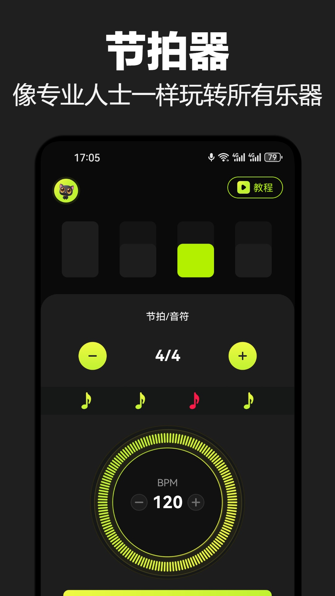 面向多乐器使用者打造,支持吉他、钢琴、小提琴等主流乐器的节奏训练场景。提供BPM无级调节、复合拍号设定(如6/8、12/8)、强弱拍视觉提示及渐进式变速练习模式。内置吉他模拟器配备完整和弦面板,可实时显示按弦位置与发声效果,配合音频反馈强化手指记忆与节奏同步能力。