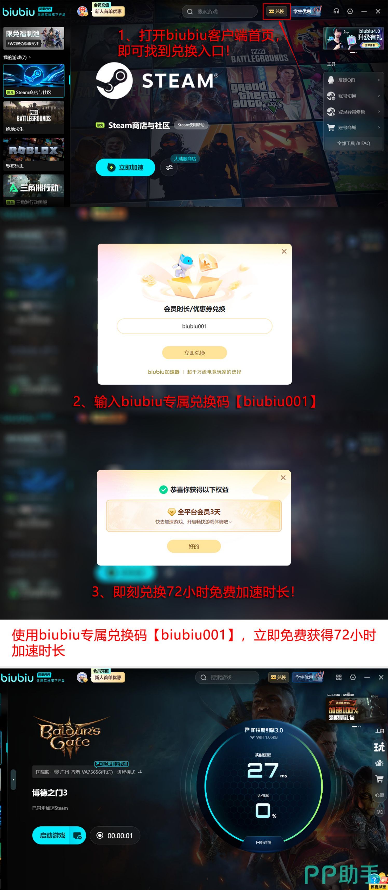 在用户权益设计上,biubiu加速器强调即用即享:新注册账号完成首次激活后,自动解锁24小时全游戏加速权限;另提供通用激活码【biubiu001】,可额外领取三天加速时长。两项福利支持叠加使用,首登用户最高可获得连续96小时无限制加速服务。