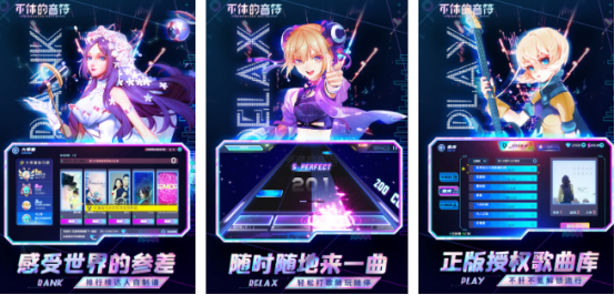 以赛博朋克美学为视觉基调,采用四轨垂直下落式音符结构。操作方式包含单指滑动切换轨道、双击触发特殊音效、长按维持连击等,适配不同曲风演奏逻辑。游戏内设嘉年华、全球巡演、挑战联赛等多线程玩法,关卡数量丰富,通关进度直接关联新曲目解锁,形成正向成长循环。