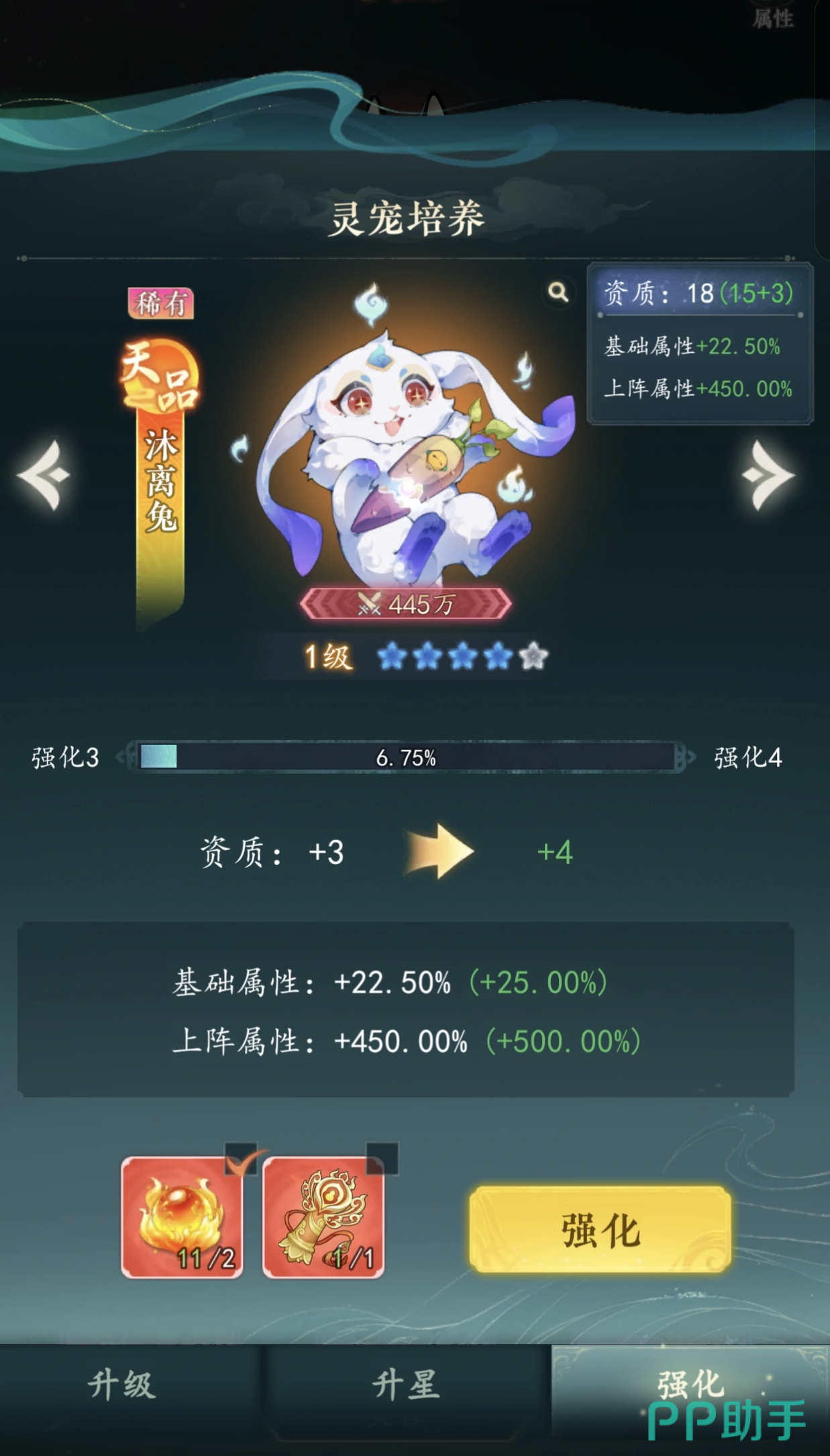 第四只为沐离兔,定位为高品质成长型灵宠。其被动直接提升玩家额外攻击力,数值收益直观;主动技能为高倍率单体爆发,前期输出强度与玩家本体持平,随技能等级提升持续增强。在PVE挑战与精英首领战中表现尤为亮眼,属于中长期值得重点投入培养的优质灵宠。