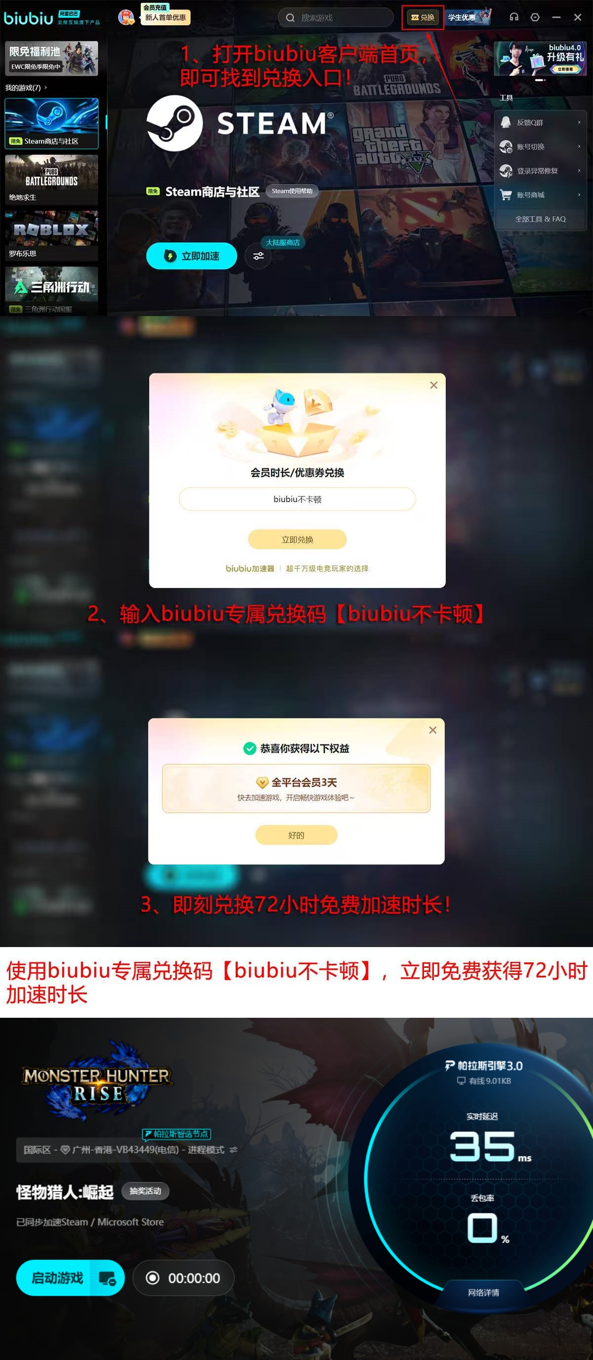 针对试用门槛问题,目前新注册用户首次登录即获赠24小时免费加速时长。用户可在客户端首页进入兑换中心,输入专属口令【biubiu不卡顿】,即可额外领取72小时使用权。新老用户均可参与,叠加后总计享有96小时无限制加速服务。