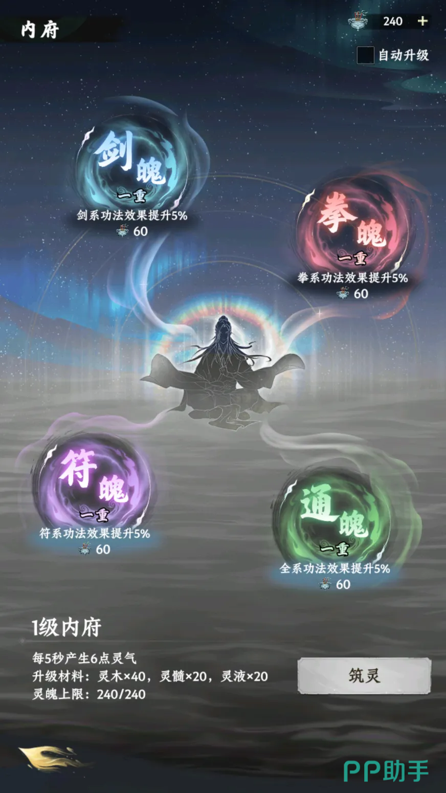 若仅侧重灵木、灵髓、灵液三类资源而忽视灵谷供给,长期运行后将引发全面罢工。此外,灵木、灵髓、灵液并不直接作用于战力,而是专用于内府系统的进阶培养。进入内府界面可见四大核心属性:剑魄、拳魄、符魄、通魄,分别对应不同职业路线的成长方向。