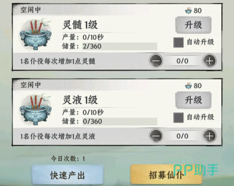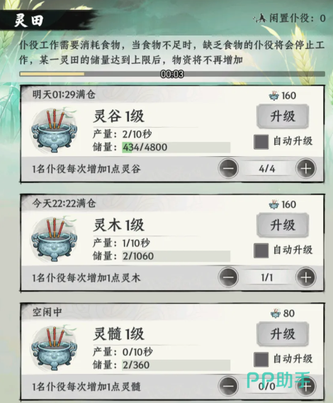 灵田的资源产出体系围绕四大基础材料构建:灵谷、灵木、灵髓、灵液。玩家需通过招募仙仆,并将其指派至对应材料的培育岗位。每位仙仆可为所驻岗位提供1点固定增长值,所有产出均以10秒为一个结算周期,实现稳定、可视化的资源累积。