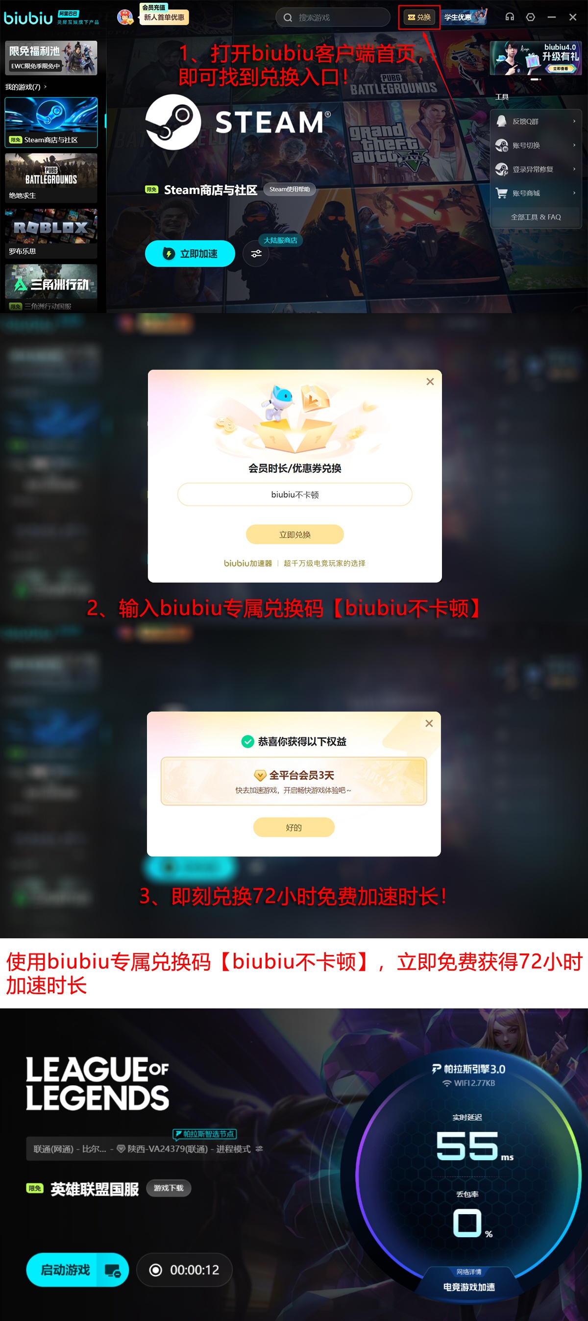 当前biubiu加速器面向全体用户提供双重时长激励政策:输入激活码【biubiu不卡顿】即可获赠72小时免费加速权限;新用户完成注册流程后额外加赠24小时,累计达96小时;学生用户还可参与专项优惠计划,需通过教育部学信网认证身份后方可解锁专属加速权益。