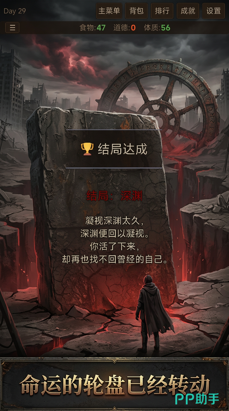 末日抉择是一款以硬核生存为基底的叙事驱动型手游。游戏设定于文明全面瓦解后的废土世界:基础设施瘫痪、社会规则失效、基础物资濒临枯竭。玩家扮演一名普通幸存者,必须在严苛限制下维系三项关键属性——食物、道德、体制。三者任一归零即判定角色死亡,且无复活机制。每一次外出搜寻、每一项资源分配、每一个即时抉择,都在同步消耗这三项数值,形成持续紧绷的生存张力。