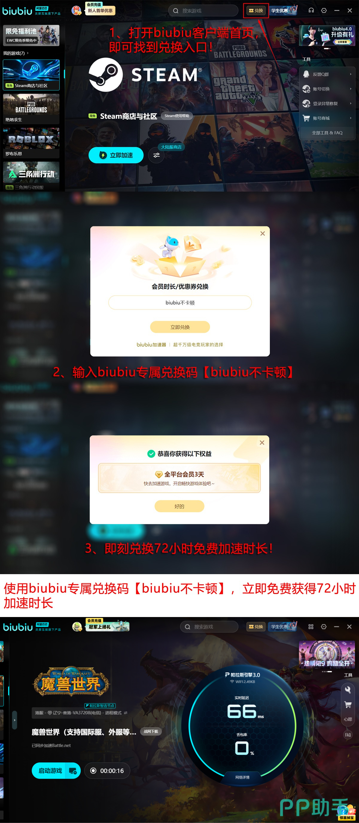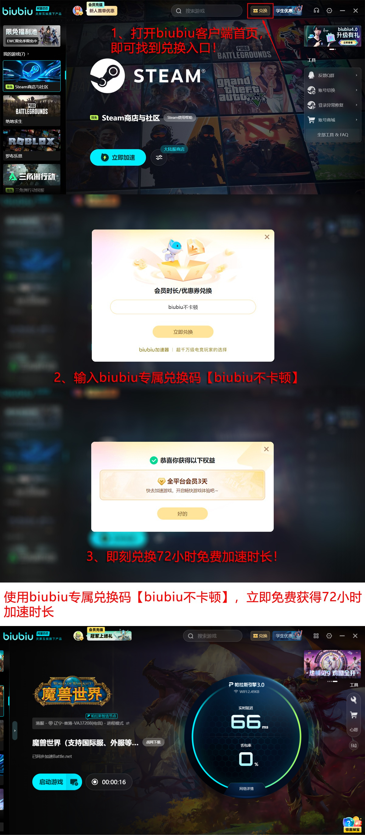 biubiu加速器不仅提供流畅稳定的网络环境,还面向新用户提供专属福利。注册即赠24小时全服通用加速时长;新老用户凭兑换码【biubiu不卡顿】,可额外领取72小时加速权益。无论当前是否遭遇突发性高延迟、频繁掉线或登录失败等问题,此项福利均可立即启用,无需额外付费。
