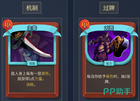 该流派的核心依赖三张关键卡牌:主宰、凶恶与残酷。主宰作为核心能力卡,每使敌人获得1层易伤,即可为自身叠加1点能量,且其消耗机制确保不会滞留于手牌中干扰抽牌节奏;凶恶承担主要过牌职能,每次施加易伤即抽一张牌,保障资源持续供给;残酷则提供稳定真实伤害,是终结阶段的重要输出手段。