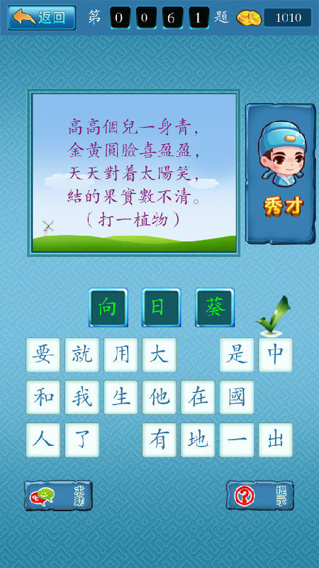专为6至12岁学龄儿童打造的启蒙向字谜产品。采用鲜明卡通UI界面与全程语音提示,大幅降低操作理解难度。题目设计侧重图形联想与日常情境还原,配合动态演示动画解析字形演变及语义关联,帮助儿童建立“形—音—义”三位一体的汉字学习路径。