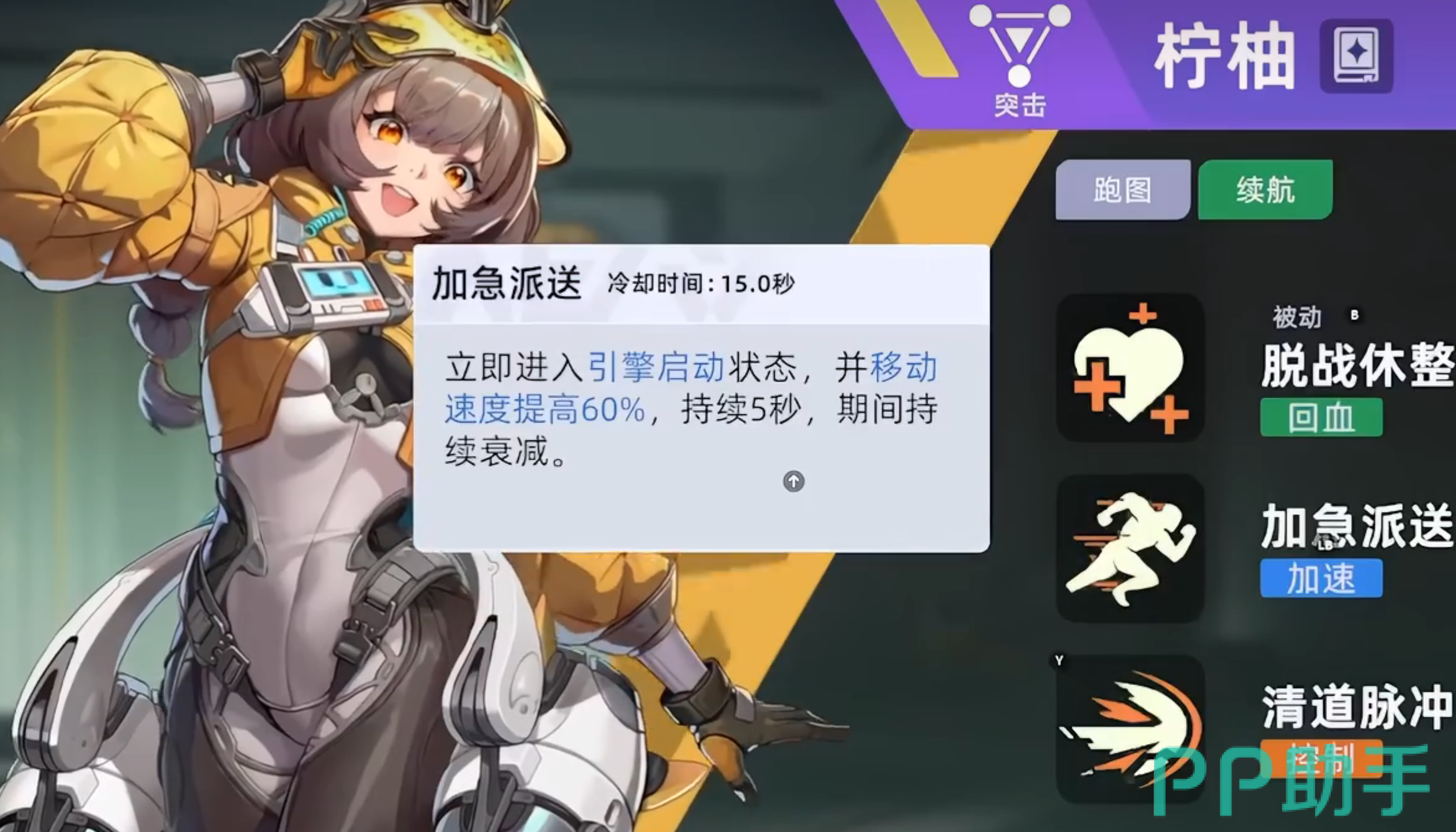 柠柚的核心生存逻辑源于其被动技能:脱离战斗状态后,自动激活“引擎启动”效果——提供15%常驻移动速度加成,并每秒恢复3%最大生命值。这一机制大幅提升了角色的战场容错率:即便被集火命中,只需短暂规避至掩体后(如墙角、箱体后方),数秒内即可完成状态回满,为二次行动争取关键窗口。